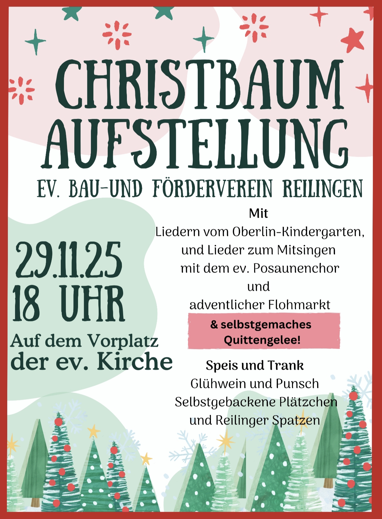 Christbaumaufstellung am 29.11.2025 um 18 Uhr, vor der Evangelischen Kirche, Reilingen Datum/Zeit 29.11.202518:00 - 20:00 Uhr Veranstaltungsort Evangelische Kirche Kategorien Kirchengemeinde