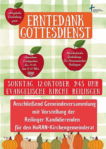 Erntedank-Gottesdienst am 12.10.2025 um 9:45Uhr in der evangelischen Kirche, anschließend Gemeindeversammlung Datum/Zeit 12.10.202509:45 - 10:45 Uhr Veranstaltungsort Evangelische Kirche Kategorien Kirchengemeinde
